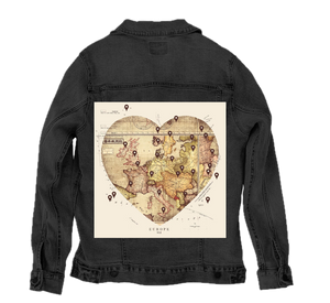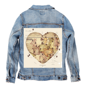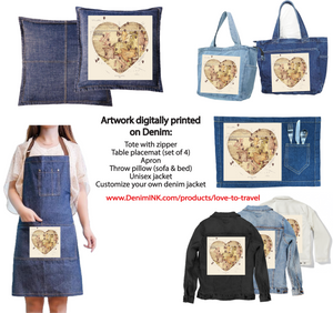 LOVE TO TRAVEL, by Tobe Fonseca,digitally printed on a hand-made Denim Jacket with 3 color choices: Stonewash, White, or Black. Unisex XS S M L XL 2X 3X