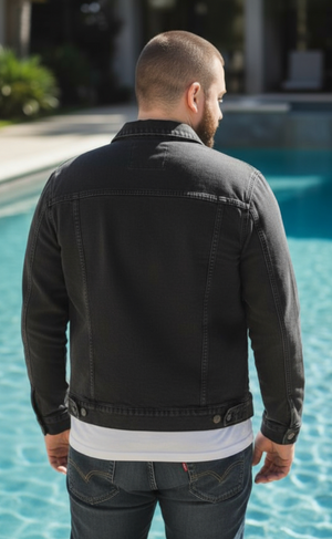 - Denim trucker jacket. 99% cotton, 1% spandex.