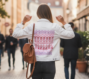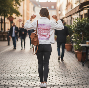 NORWEGIAN PATTERN by Catcoq, digitally printed on a hand-made Denim Jacket with 3 color choices: Stonewash, White, or Black. Unisex XS S M L XL 2X 3X
