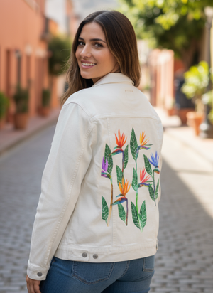 BIRD OF PARADISE2 by HEND SHEHATA, digitally printed on a hand-made Denim Jacket with 3 color choices: Stonewash, White, or Black. Unisex XS S M L XL 2X 3X