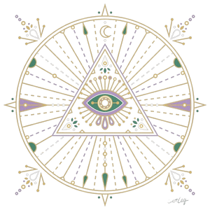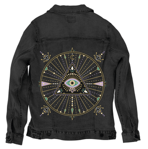 EVIL EYE MANDALA by Catcoq,digitally printed on a hand-made Denim Jacket with 3 color choices: Stonewash, White, or Black. Unisex XS S M L XL 2X 3X