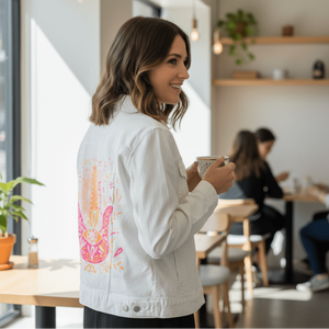 HAMSA HAND by Catcoq,digitally printed on a hand-made Denim Jacket with 3 color choices: Stonewash, White, or Black. Unisex XS S M L XL 2X 3X