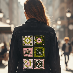 TALAVERA MEXICAN TILE by Catcoq, digitally printed on a hand-made Denim Jacket with 3 color choices: Stonewash, White, or Black. Unisex XS S M L XL 2X 3X