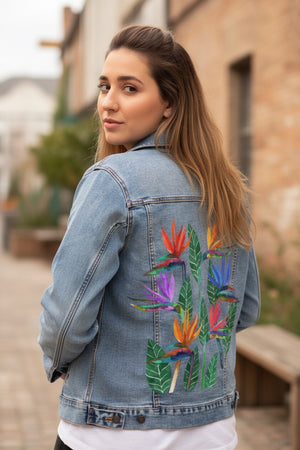 BIRD OF PARADISE1 by HEND SHEHATA, digitally printed on a hand-made Denim Jacket with 3 color choices: Stonewash, White, or Black. Unisex XS S M L XL 2X 3X