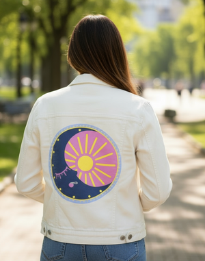 SOLUNA by HEND SHEHATA, digitally printed on a hand-made Denim Jacket with 3 color choices: Stonewash, White, or Black. Unisex XS S M L XL 2X 3X
