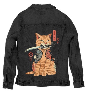 CATANA by Vincent Trinidad,digitally printed on a hand-made Denim Jacket with 3 color choices: Stonewash, White, or Black. Unisex XS S M L XL 2X 3X