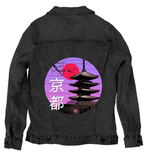 KYOTO WAVE by Vincent Trinidad,digitally printed on a hand-made Denim Jacket with 3 color choices: Stonewash, White, or Black. Unisex XS S M L XL 2X 3X