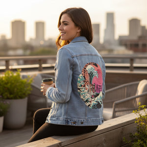 RAD TIGER WAVE by VincentTrinidad,digitally printed on a hand-made Denim Jacket with 3 color choices: Stonewash, White, or Black. Unisex XS S M L XL 2X 3X
