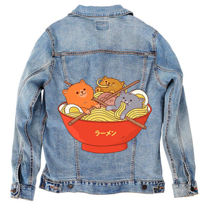 RAMEN AND CATS by Pepe Rodriguez aka PPMID, digitally printed on a hand-made Denim Jacket with 3 color choices: Stonewash, White, or Black. Unisex XS S M L XL 2X 3X