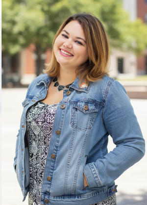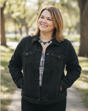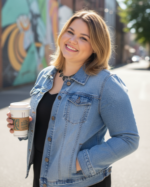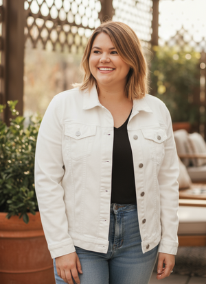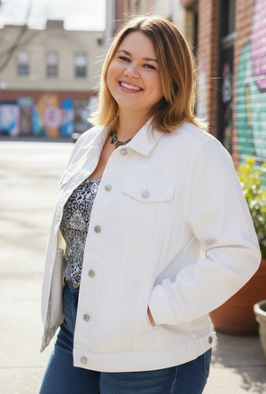 - Denim trucker jacket. 99% cotton, 1% spandex.