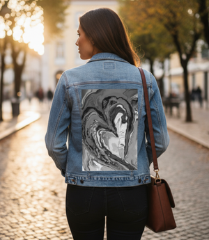 HEART MARBLE by RAMIR DESIGNS, digitally printed on a hand-made Denim Jacket with 3 color choices: Stonewash, White, or Black. Unisex XS S M L XL 2X 3X