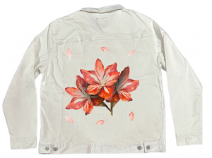 3 RED FLOWERS by RAMIR DESIGNS, digitally printed on a hand-made Denim Jacket with 3 color choices: Stonewash, White, or Black. Unisex XS S M L XL 2X 3X
