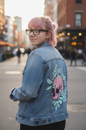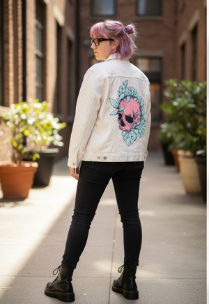 BOTANICAL SKULL by Jess Adams,digitally printed on a hand-made Denim Jacket with 3 color choices: Stonewash, White, or Black. Unisex XS S M L XL 2X 3X