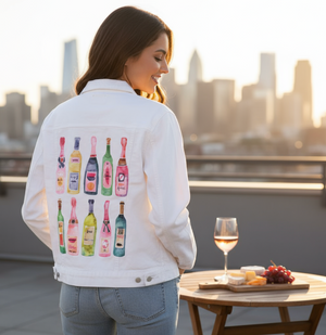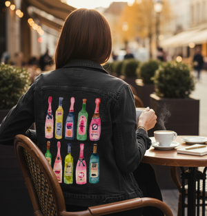 CHAMPAGNE COLLECTION by Catcoq,digitally printed on a hand-made Denim Jacket with 3 color choices: Stonewash, White, or Black. Unisex XS S M L XL 2X 3X