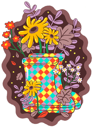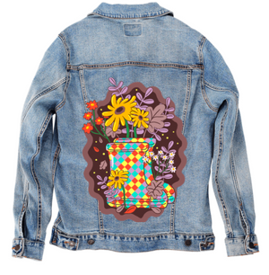 COLORFALL SEASON BOOTS by INDYSIGN, digitally printed on a hand-made Denim Jacket with 3 color choices: Stonewash, White, or Black. Unisex XS S M L XL 2X 3X