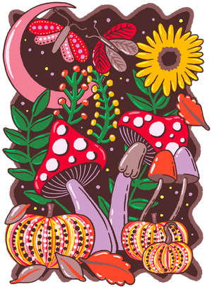 COLORFALL SEASON SHROOMS AND MOTHS by INDYSIGN, digitally printed on a hand-made Denim Jacket with 3 color choices: Stonewash, White, or Black. Unisex XS S M L XL 2X 3X