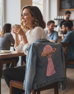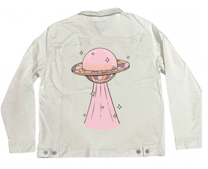 DISCO UFO by KITSCH AND CURATE, digitally printed on a hand-made Denim Jacket with 3 color choices: Stonewash, White, or Black. Unisex XS S M L XL 2X 3X