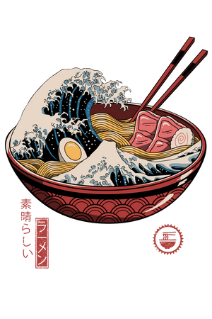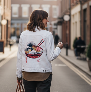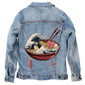 GREAT RAMEN WAVE by Vincent Trinidaddigitally printed on a hand-made Denim Jacket with 3 color choices: Stonewash, White, or Black. Unisex XS S M L XL 2X 3X