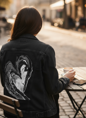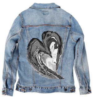 HEART MARBLE by RAMIR DESIGNS, digitally printed on DENIM products: throw pillows, aprons, table place mats, hand-made Unisex Denim Jackets in 3 color choices