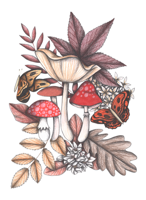 MUSHROOM MAGIC 3 by CECILIA BATTAINI, digitally printed on a hand-made Denim Jacket with 3 color choices: Stonewash, White, or Black. Unisex XS S M L XL 2X 3X
