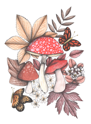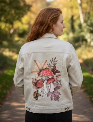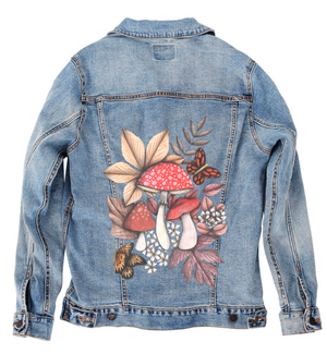 MUSHROOMS MAGIC 1 by CECILIA BATTAINI, digitally printed on a hand-made Denim Jacket with 3 color choices: Stonewash, White, or Black. Unisex XS S M L XL 2X 3X