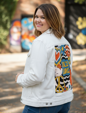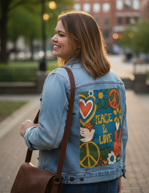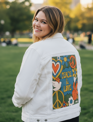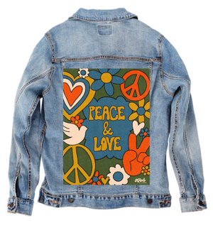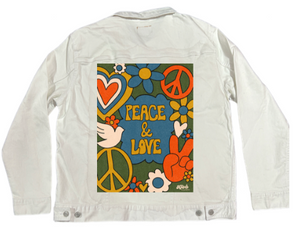 PEACE AND LOVE GREEN by KITSCH AND CURATE, digitally printed on a hand-made Denim Jacket with 3 color choices: Stonewash, White, or Black. Unisex XS S M L XL 2X 3X