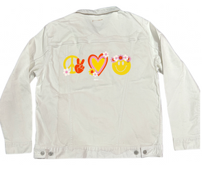 PEACE LOVE HAPPINESS by KITSCH AND CURATE, digitally printed on a hand-made Denim Jacket with 3 color choices: Stonewash, White, or Black. Unisex XS S M L XL 2X 3X