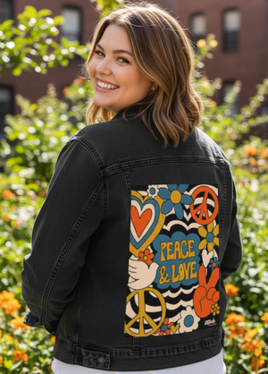 PEACE LOVE STRIPES by KITSCH AND CURATE, digitally printed on a hand-made Denim Jacket with 3 color choices: Stonewash, White, or Black. Unisex XS S M L XL 2X 3X