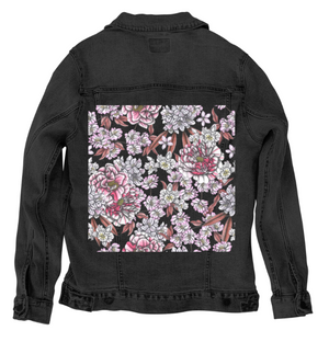PINK AFTERNOON by CECILIA BATTAINI, digitally printed on a hand-made Denim Jacket with 3 color choices: Stonewash, White, or Black. Unisex XS S M L XL 2X 3X