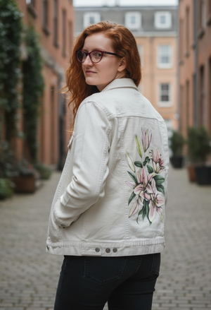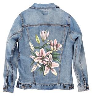 PINK LILIES by CECILIA BATTAINI, digitally printed on a hand-made Denim Jacket with 3 color choices: Stonewash, White, or Black. Unisex XS S M L XL 2X 3X