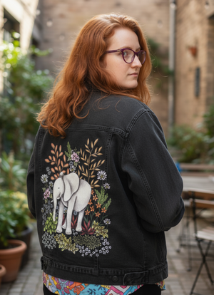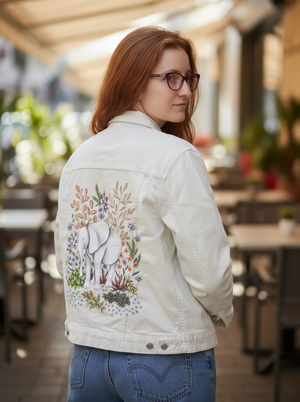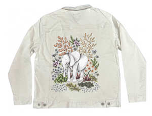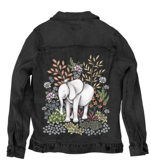 SAFARI ELEPHANT by CECILIA BATTAINI, digitally printed on a hand-made Denim Jacket with 3 color choices: Stonewash, White, or Black. Unisex XS S M L XL 2X 3X