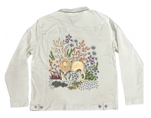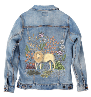 SAFARI LION by CECILIA BATTAINI, digitally printed on a hand-made Denim Jacket with 3 color choices: Stonewash, White, or Black. Unisex XS S M L XL 2X 3X