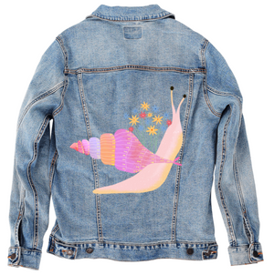 SNAIL MAIL by THEARTIC SOUL, digitally printed on a hand-made Denim Jacket with 3 color choices: Stonewash, White, or Black. Unisex XS S M L XL 2X 3X