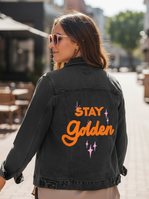 STAY GOLDEN by INDYSIGN, digitally printed on a hand-made Denim Jacket with 3 color choices: Stonewash, White, or Black. Unisex XS S M L XL 2X 3X