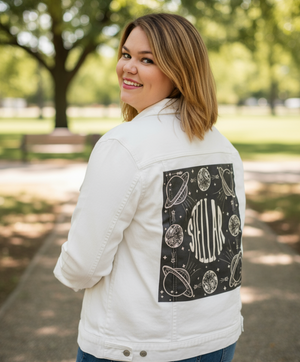 STELLAR by KITSCH AND CURATE, digitally printed on a hand-made Denim Jacket with 3 color choices: Stonewash, White, or Black. Unisex XS S M L XL 2X 3X