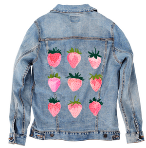STRAWBERRY DREAMS by THEARTICSOUL, digitally printed on a hand-made Denim Jacket with 3 color choices: Stonewash, White, or Black. Unisex XS S M L XL 2X 3X