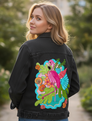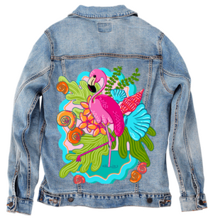 TROPICAL PARADISE FLAMINGO by INDYSIGN, digitally printed on a hand-made Denim Jacket with 3 color choices: Stonewash, White, or Black. Unisex XS S M L XL 2X 3X