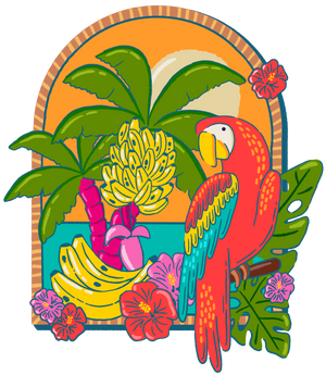 TROPICAL PARADISE PARROT by INDYSIGN, digitally printed on a hand-made Denim Jacket with 3 color choices: Stonewash, White, or Black. Unisex XS S M L XL 2X 3X