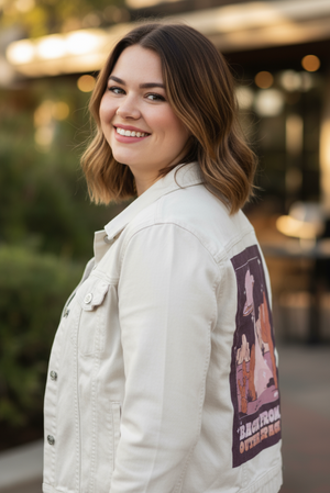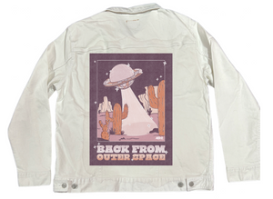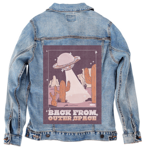 UFO SPACE PURPLE by KITSCH AND CURATE, digitally printed on a hand-made Denim Jacket with 3 color choices: Stonewash, White, or Black. Unisex XS S M L XL 2X 3X