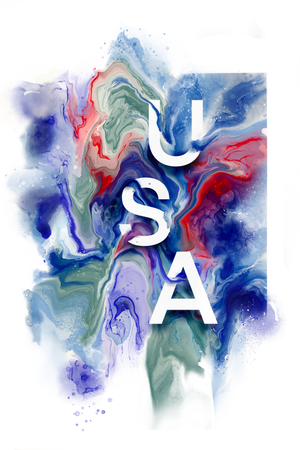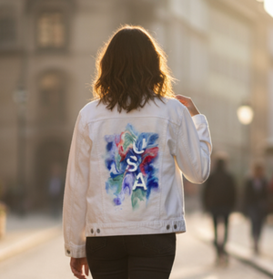 USA ABSTRACT by RAMIR DESIGNS, digitally printed on a hand-made Denim Jacket with 3 color choices: Stonewash, White, or Black. Unisex XS S M L XL 2X 3X