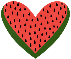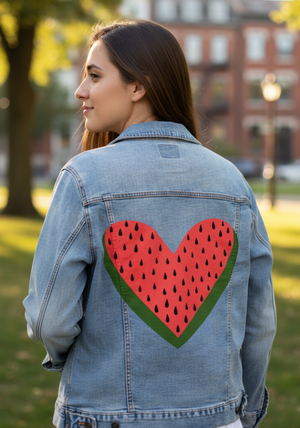 WATERMELON HEART by HEND SHEHATA, digitally printed on a hand-made Denim Jacket with 3 color choices: Stonewash, White, or Black. Unisex XS S M L XL 2X 3X