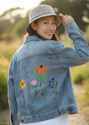 WILDFLOWERS by THEARTICSOUL, digitally printed on a hand-made Denim Jacket with 3 color choices: Stonewash, White, or Black. Unisex XS S M L XL 2X 3X
