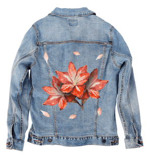 3 RED FLOWERS by RAMIR DESIGNS, digitally printed on a hand-made Denim Jacket with 3 color choices: Stonewash, White, or Black. Unisex XS S M L XL 2X 3X