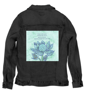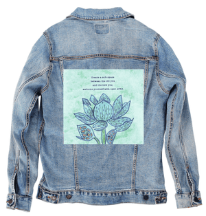 ALWAYS WELCOME YOURSELF by CANVAS and QUOTATIONS, digitally printed on a hand-made Denim Jacket with 3 color choices: Stonewash, White, or Black. Unisex XS S M L XL 2X 3X.