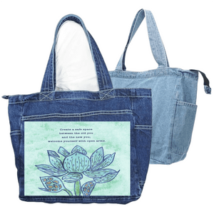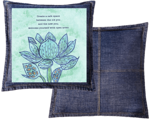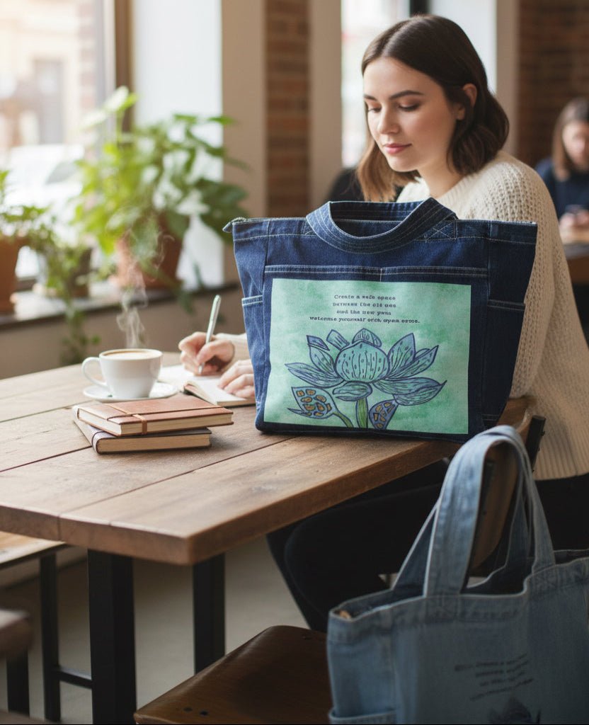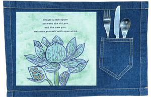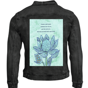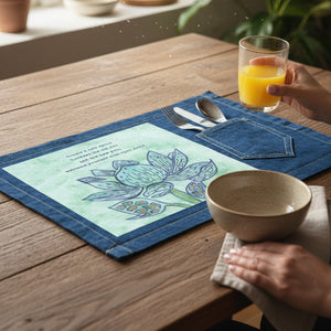 On black denim, the pale mint background glows softly against the dark base, and the lotus appears almost illuminated from within. The blue petals deepen into jewel tones, and the gold in the seed pods becomes small points of warmth. The text remains readable but feels more intimate, like something spoken quietly rather than posted publicly.