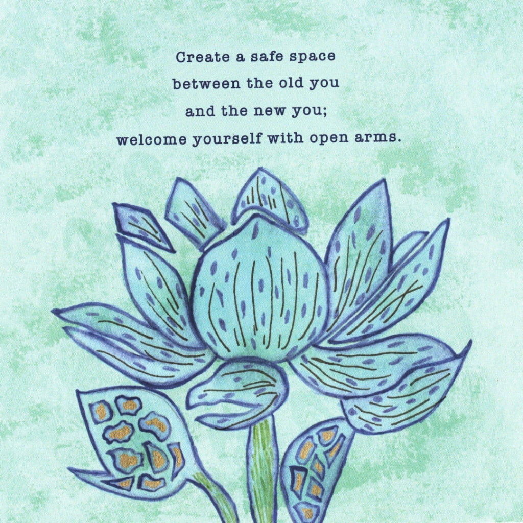 A hand-drawn blue lotus flower with layered petals outlined in dark blue ink and dotted with short vertical marks. two seed pods with golden oval shapes extend from the stem. The background is a textured wash of pale mint green. centered above the flower is black handwritten-style text reading “Create a safe space between the old you and the new you; welcome yourself with open arms.” This artwork is titled “Always Welcome Yourself” and created by Canvas & Quotations (Monika Chugh and Alka Chopra)
