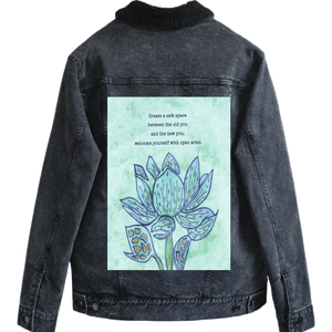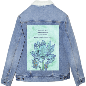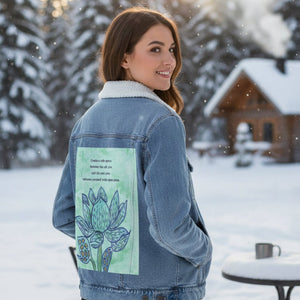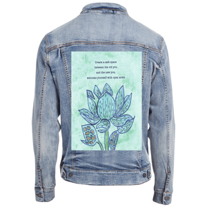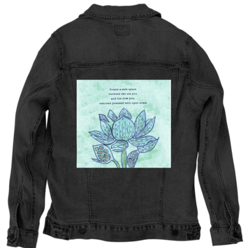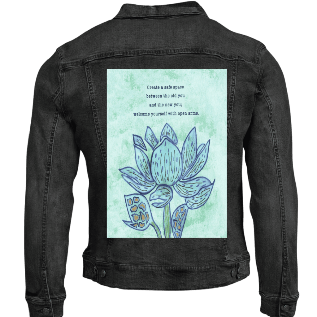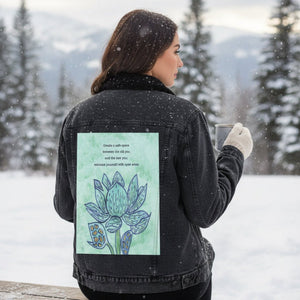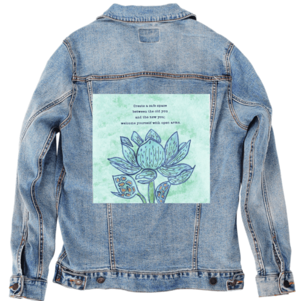 On stonewashed denim, the mint background softens further, becoming cloud-like as pigment spreads into the worn grain. The blue washes of the petals blur slightly at their edges, while the dark outlines stay legible, making the flower feel remembered rather than newly drawn. The gold seed shapes mellow into warm flecks embedded in cloth. The emotional tone shifts toward gentleness and self-forgiveness — a message revisited many times.