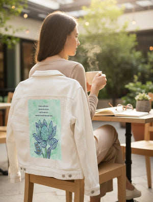 On white denim, clarity takes hold. The text becomes sharply readable, the outlines crisp, and the petal structures easy to follow. The contrast between cool blue and warm gold is strongest here, giving the piece a feeling of present awareness. This clarity matters because the message reads as an active choice, not a reflection.