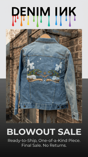 This is a single, ready-to-ship, printed DenimINK jacket that was not sent to its original order (ex: wrong size/color, minor print variance, or print not as vibrant as intended). It’s still a wearable, statement piece — priced to move.