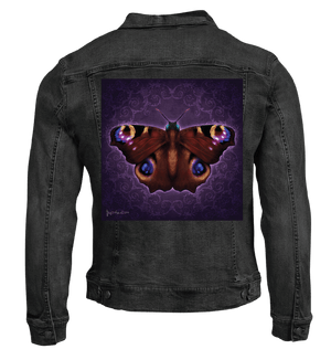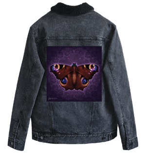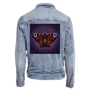 On stonewashed denim, the butterfly’s glow softens and spreads. The violet background diffuses into the fabric grain, and the damask pattern becomes more atmospheric, like a memory of pattern rather than a strict design. The blue eye spots deepen and mellow, losing sharp edges while retaining their depth. Emotionally, the piece feels intimate and antique, like a textile-inspired relic worn smooth over time.